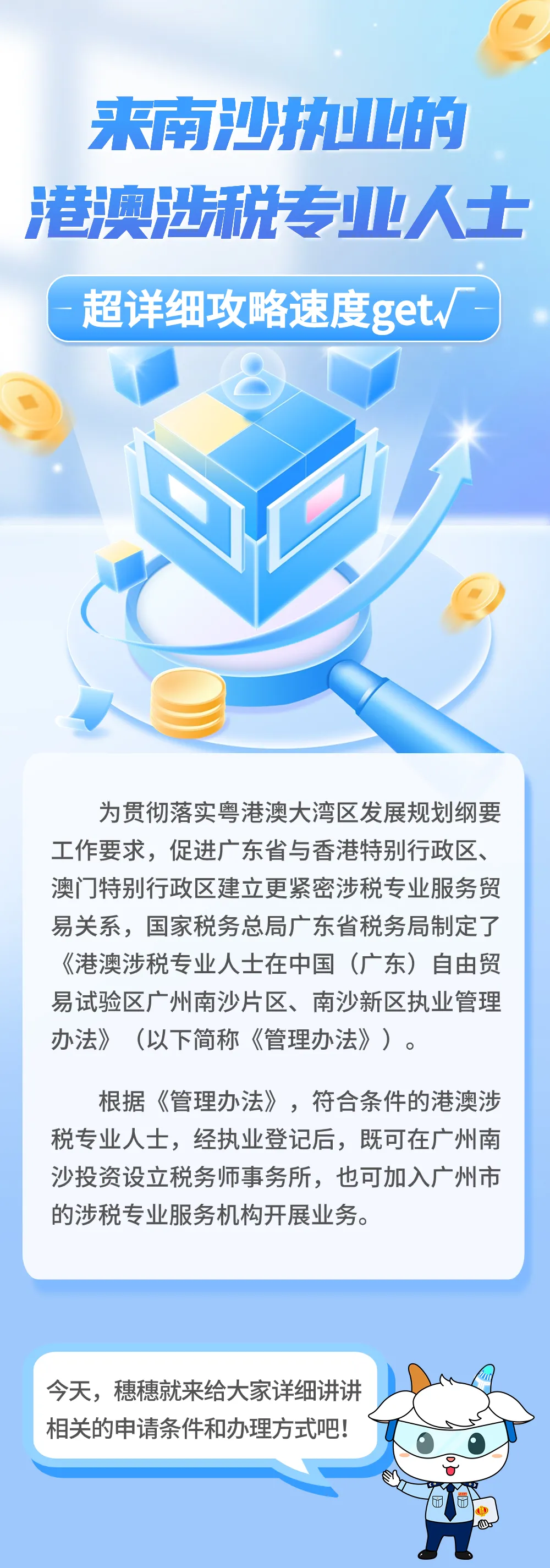 为贯彻落实粤港澳大湾区发展规划纲要工作要求,促进广东省与香港特别行政区、澳门特别行政区建立更紧密涉税专业服务贸易关系,国家税务总局广东省税务局制定了《港澳涉税专业人士在中国(广东)自由贸易试验区广州南沙片区、南沙新区执业管理办法》。